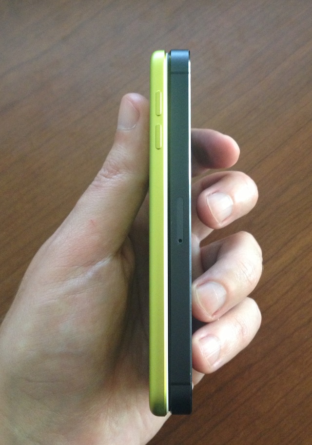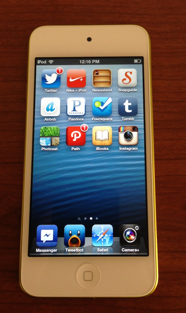 It’s interesting that all of the iPod touches feature a white front face except the slate version, which features a black front face. This also gives the iPod touch a more playful quality than its iPhone brethren as you can clearly see the accent of the color you chose along the outer rim of the device. For example, on this yellow iPod touch, I see a rim of shiny, polished yellow when I look at the device. I’ve heard aspects of iPhone 5 design described as “jewlery-like”, this is even more so.