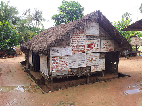 About 50 feet from the bustling main drag in Cambodia’s wealthiest town, I stumbled across the school photographed above, a one-room, benches-and-blackboards building straight out of Little House on the Prairie. I’m sure it’s quite nice for what it is, but I couldn’t help but think: “No tech at all? How much better it would be if there were at least some modern technology in every school like this; not the deluded pointlessness of One Laptop Per Child, but something more like Ten Smartphones Per Teacher. Of course, they’d be so valuable, you’d have to worry about theft…unless you had some central database that tracked their locations, and would disable them when stolen, so they wouldn’t be valuable any more…”