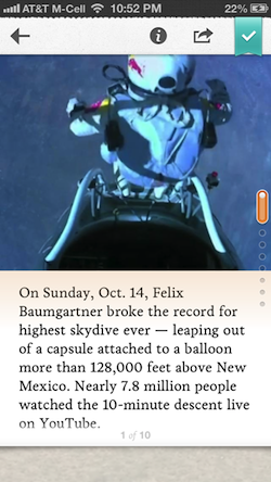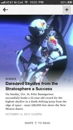 Will this type of rapid-fire, bite-sized news delivery start a new trend? Well, it’s something that’s already happening on Twitter. More often than not, I get breaking news on Twitter first, in 140 characters or less. Sometimes there’s a link to a full article, but sometimes it’s information that tells the whole story. For example, when there’s an earthquake in San Francisco, I follow an account that tells me when it was and how big it was. I don’t have to read anything further, I get the gist. What Circa is, is a hybrid of those two models, and I personally like it.
