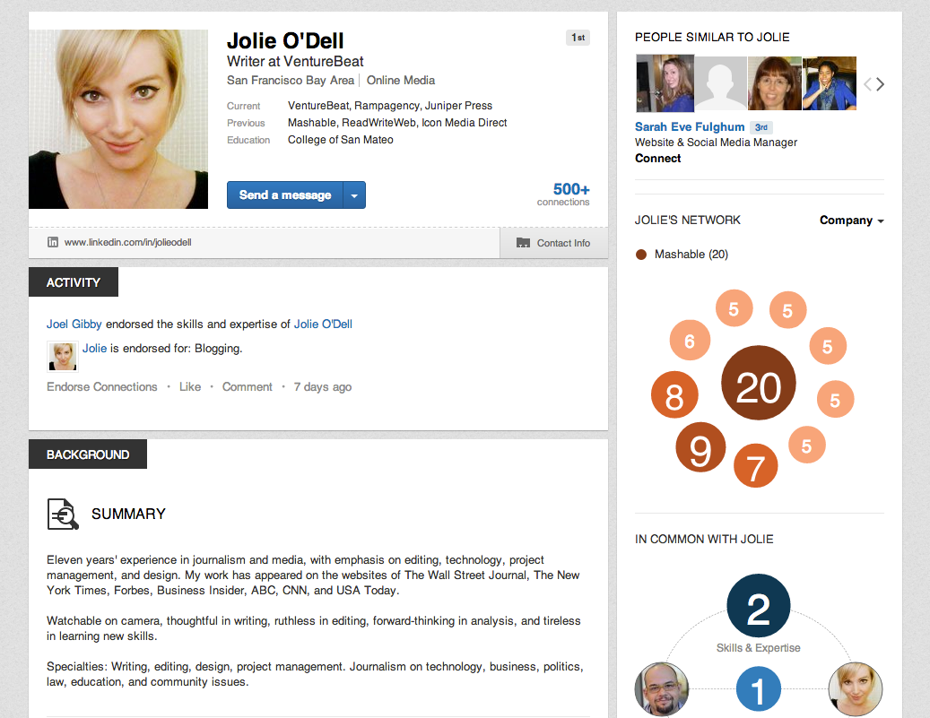 It’s been rebuilt from the ground up, and we’re taking a look at it now. LinkedIn has made it super easy to add new things to your profile, such as skills and has added people you may know. There is now a visualization of profile completeness, which is rad. You’ll notice the brand new “Improve Your Profile” button, which is way nicer than saying “Hey, add your college”, etc. to your users.