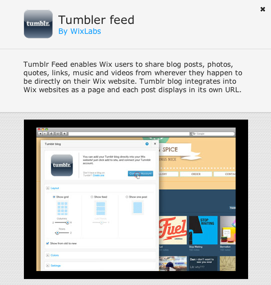 Vanity stats aside, the new marketplace offers Wix an opportunity to scale its functionality, while keeping development costs to a minimum. To give users a taste of what it hopes will become a deep repository of apps and widgets, at launch today, the Wix App Market includes 25 apps, like Instagram, Tumblr, Soundcloud, DaPulse and RumbleTalk. So, now, when building their website using its HTML5 tools, users can connect their sites to their photo feed, blog archives and music playlists.