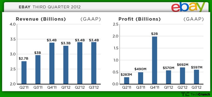 eBay just released Q3 earnings this afternoon, reporting earnings per share of $0.55 on revenue of $3.4 billion. Analysts expected EPS of $0.54 and revenue of $3.4 billion for Q3 2012.