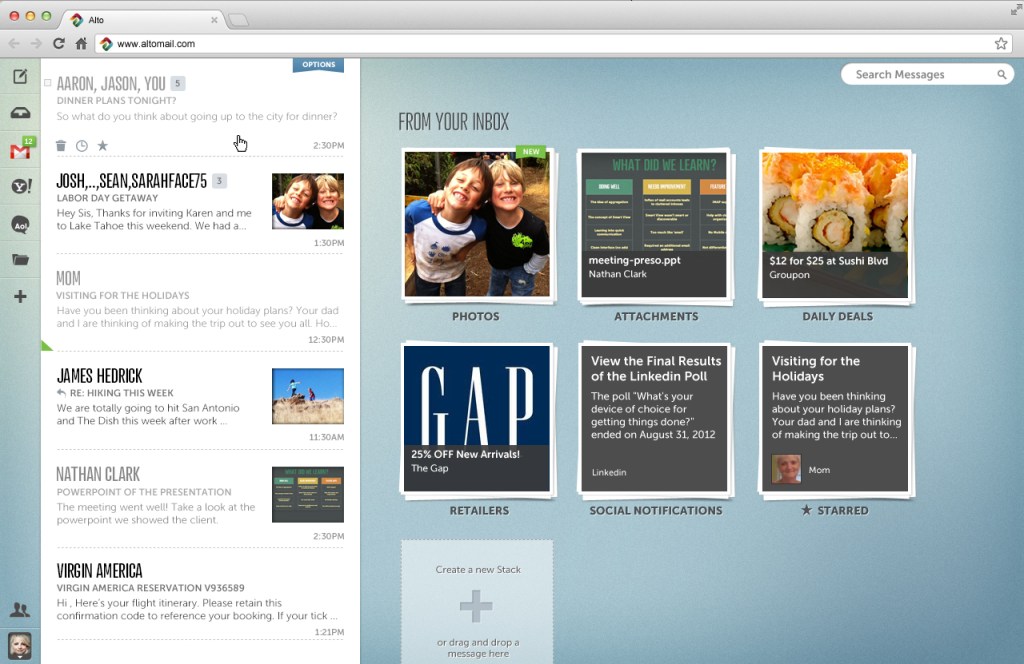 The biggest change in Alto versus other email clients is a new concept called Stacks. They basically function as a way to pre-sort your email, so that you’re not stuck reading through daily deals from Groupon and notifications from Facebook when all you really want to do is see if you’ve got a new message from your friends and family. They’re like folders or labels, but managed through an intuitive drag-and-drop interface, and allowing users to decide that they want to make large swaths of their email bypass the main inbox entirely, to be saved in Stacks where they can be read later.