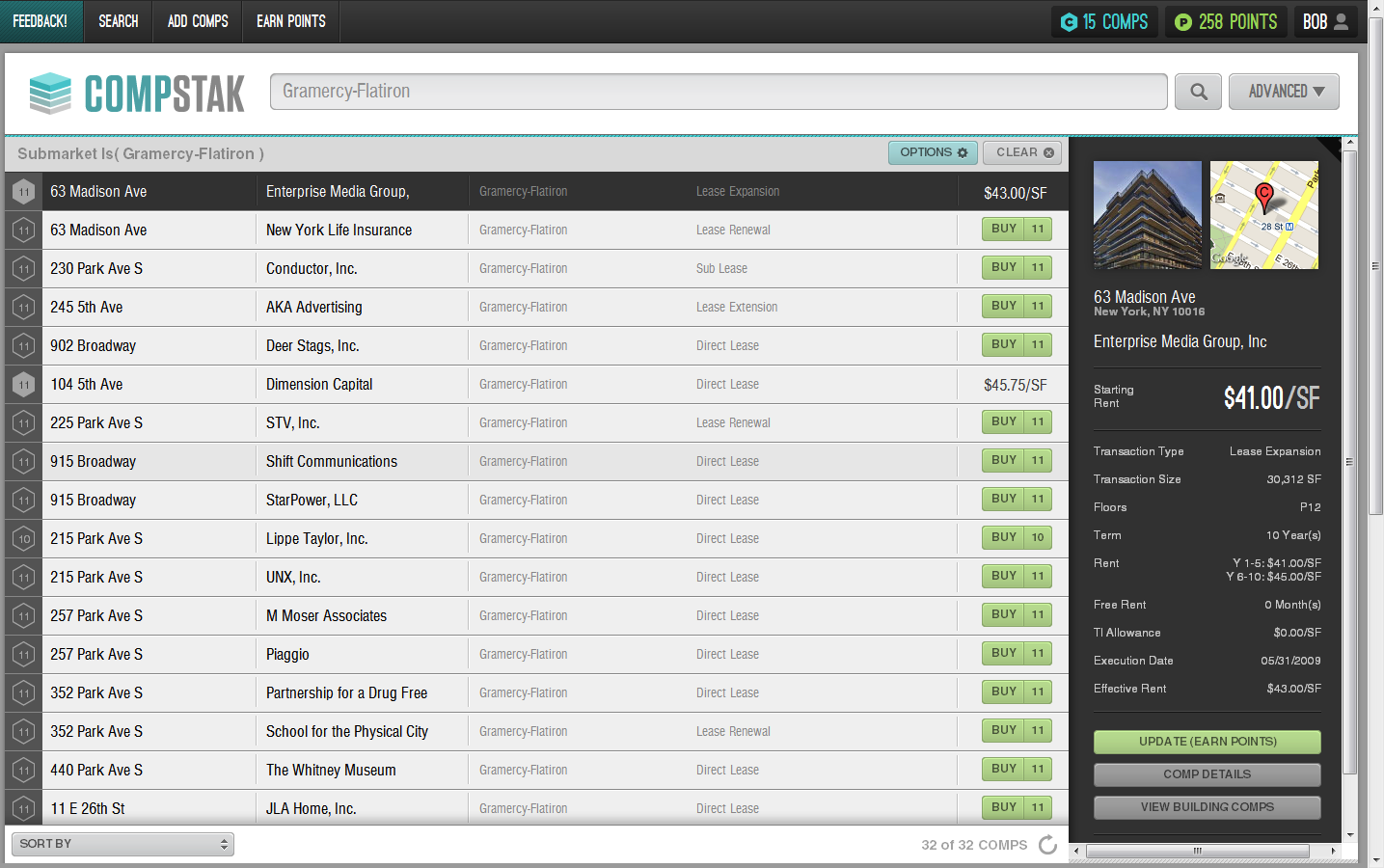 Rather than trying to buy it, CompStak seeded its database thanks to some broker friends and set up a barter system, where anyone with access to lease comps could upload them to earn points they could spend to access other comps. That means its data set is snowballing without costing CompStak anything.