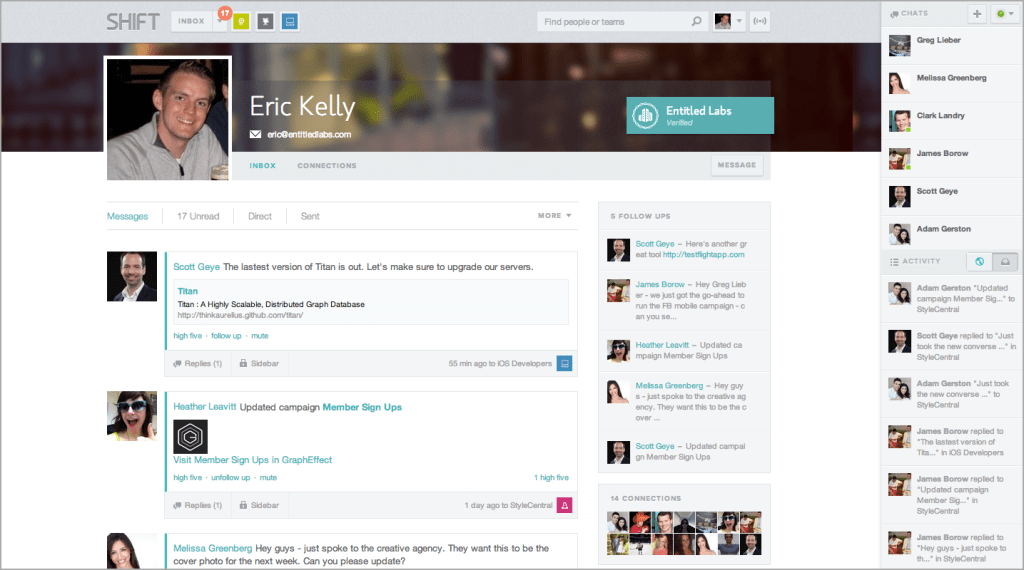 And Shift.com is a real platform, with a set of apps that have already integrated with site, and which can post activity directly to the different teams. Not surprisingly, GraphEffect itself has been integrated with Shift.com, so users could update a campaign in GraphEffect and that would be shared with the relevant teams on Shift.com, who can then discuss the changes. The other initial platform partners are order management service Lettuce, mobile ad buyer GradientX, app developer Hyfn, digital marketer Kenshoo, and recruiting software The Resumator.