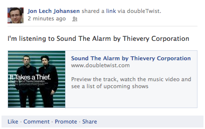 DoubleTwist, the popular desktop and mobile alternative to iTunes, has just launched a social sharing feature which allows its users to post what they’re listening to on Facebook or Twitter. Alongside the message text, the post also includes a link that, when clicked, will take visitors to a custom webpage offering an artist bio, news, concert dates, and the corresponding music video.
