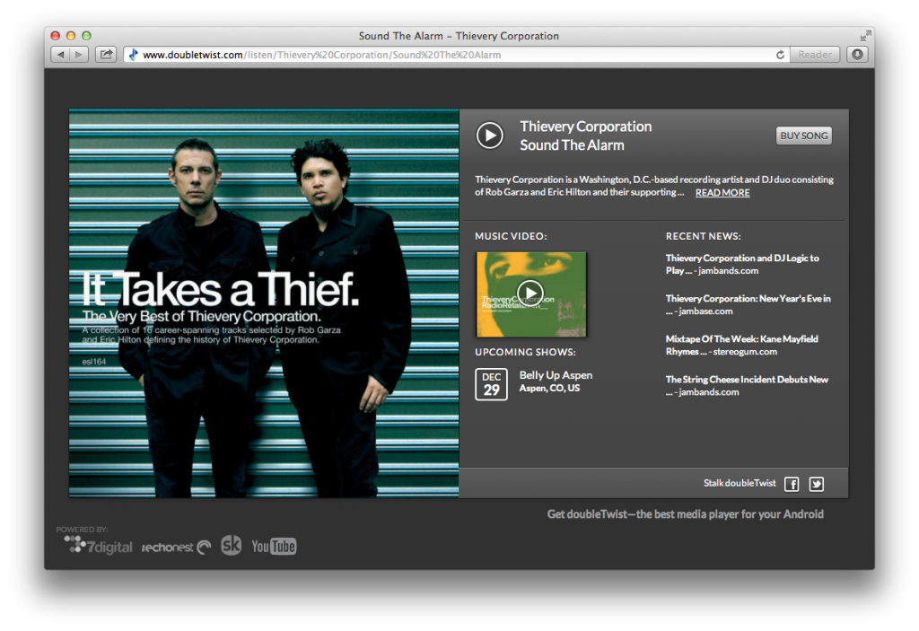 These artist profile pages are powered by 7Digital and The Echo Nest, says DoubleTwist. (Incidentally, 7Digital is all over the news this week. It also just announced a partnership with RIM to power the BlackBerry 10 music store, as well as a $10 million infusion of capital.) Other content on these artist pages is sourced from Songkick, YouTube, and Last.fm. The “Buy” button, of course, takes you to 7Digital’s store.