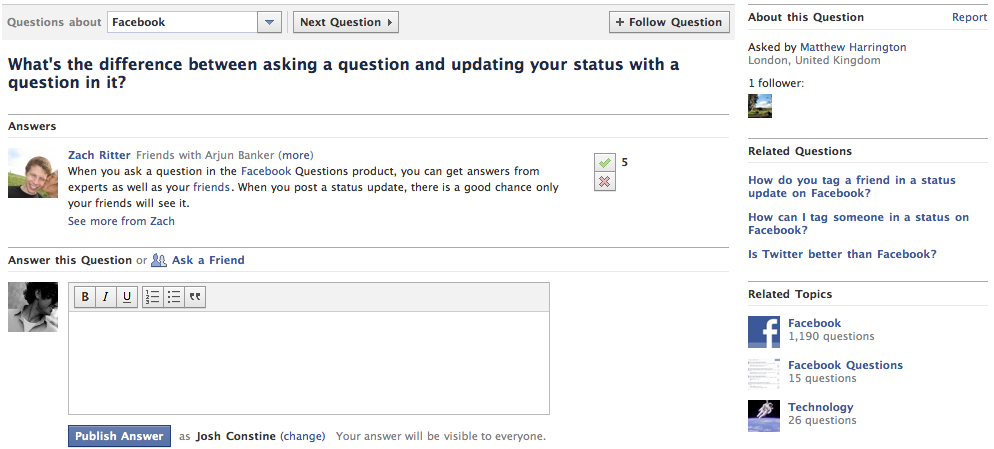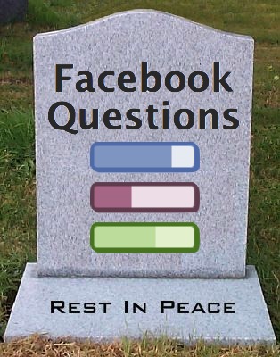 In the end, Questions never seemed to gain traction, or at least I’ve rarely seen a question asked in the last year. Marketing Land has a great discussion of how Facebook has been quietly minimizing the feature over the past few months, including stripping it out of the sidebar bookmarks on the home page
