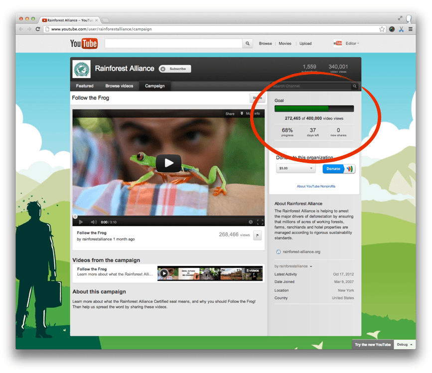 “YouTube Campaigns” allows nonprofits to set a campaign goal for their videos. For example, maybe you could do something where if your video hits 1M views, a company will donate a certain amount of money. The nonprofit can then turn to their supporters and ask them to spread the word.