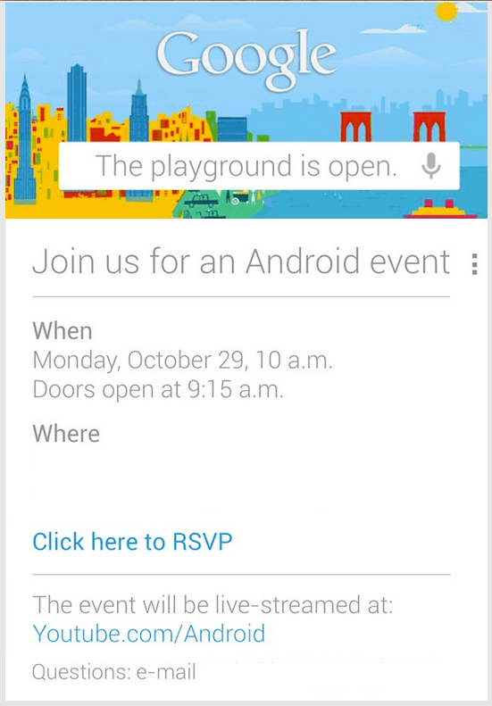 Google’s invitation went out late last week, and adds to an already crowded event calendar at the end of October that includes multiple Microsoft events, as well as ones from Apple and Samsung. Unveiling a refreshed, budget tablet line as well as a new Nexus phone one week after Apple’s iPad mini reveal would have clear strategic value for Google in terms of taking the wind out of its competitor’s sales going into the holiday shopping season, so the details of this report definitely make sense from that perspective. We’ll be there covering the event as it happens, though, so we’ll let you know exactly what does get presented by Google on October 29.