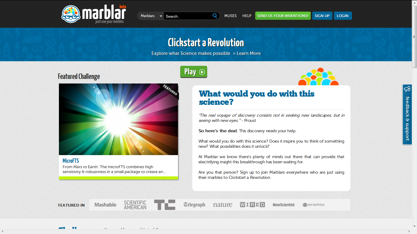 The way Marblar hopes to engineer this type of serendipity is deceptively simple: The authors of un-commercialised discoveries work with the Marblar team to post a listing of their invention — distilled in an accessible, yet comprehensive form — from which the crowd are tasked with drilling further into its capabilities and, in contest form, enter ideas for possible commercial uses. Each ‘entry’ is then voted upon by the Marblar community, while there’s a wiki-like Q&A section so that users can interact with and bounce ideas off of the invention’s author. There’s also a heavy dose of gamification, users earn points — marbles — and trophies for their participation.