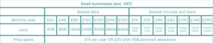 EE is also offering shared data tariffs for SMEs so they can spread data usage limits across employees. These packages start at £15 per user — or £25 per user if each user has a 4GB allowance — plus whatever shared data/minutes/texts the business wants to apportion to their users collectively