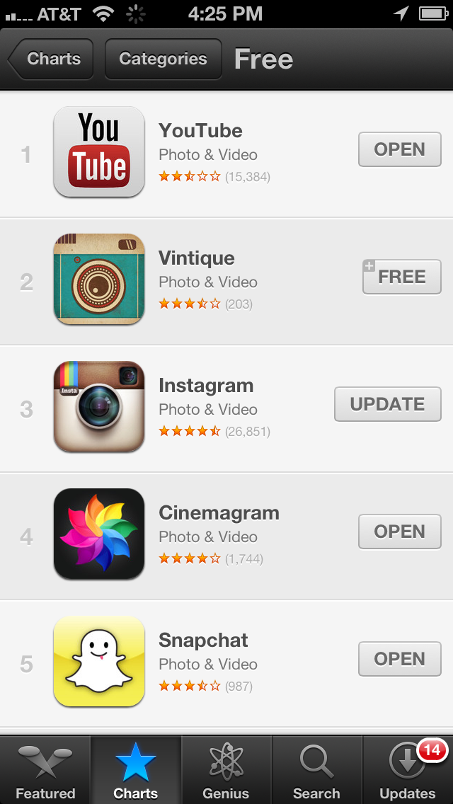 There are two others that have had a sustained presence on the top free app charts over the last few weeks. Both Cinemagram and Snapchat have very unique takes on the photography genre.