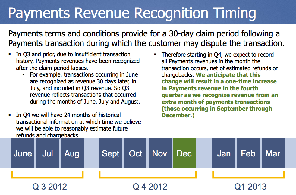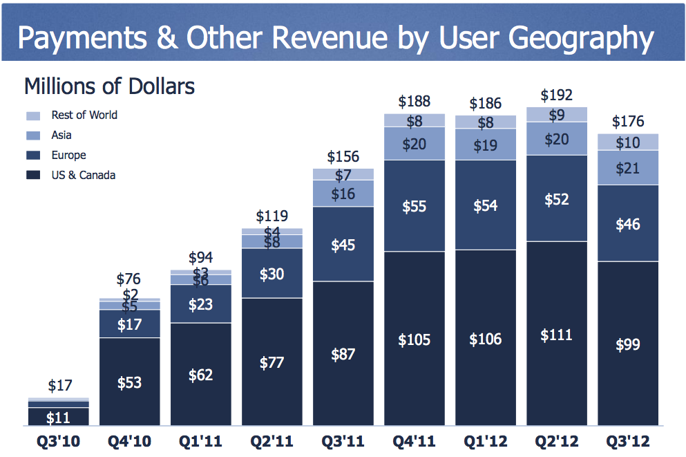 Facebook says this figure may rebound this quarter because it’s changing the way it recognizes payments revenue. Before, consumers had a month to dispute charges so payments revenue would actually be recording transactions that were at least a month old. This quarter, the company will record payments revenue as it happens, so there might be an artificial bump this quarter.
