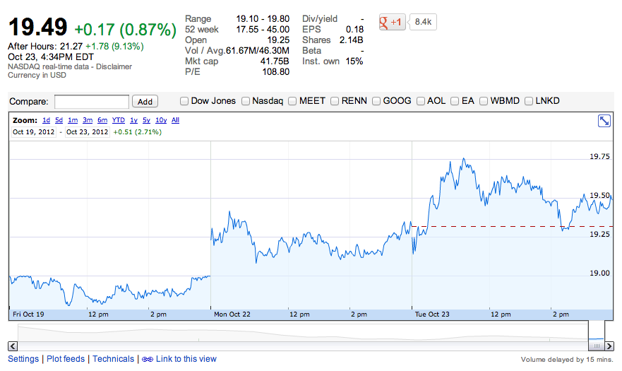 Stoked by a bump in advertising revenues and increasing evidence that Facebook is making money from users on mobile devices, Wall Street investors sent shares of the company up by 9.8 percent in after-hours trading. Facebook is trading at $21.39, up from today’s close of $19.49.