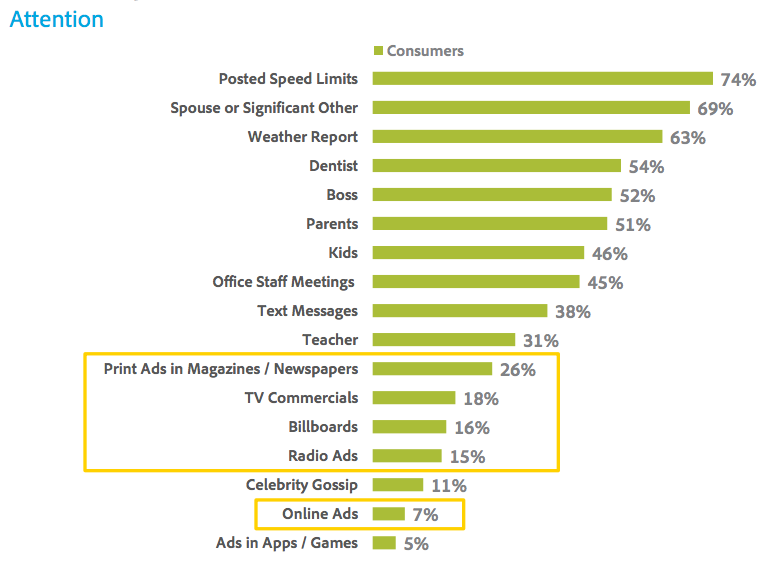 Adobe has put out some more research into online advertising. This time it’s not an Index of the market but a poll of 1,250 U.S. consumers and marketers’ views on online advertising. The survey makes amusing reading at times — almost half of the respondents agree ‘online advertising is creepy and stalks you’, and more than half agree that ‘most marketing is a bunch of B.S.’. The poll also underlines the ongoing problem with online ads failing to capture people’s attention — only in-app/in-game ads fared worse in the battle for consumers’ attention, with print-based ads and TV commercials grabbing far more consumer mindshare