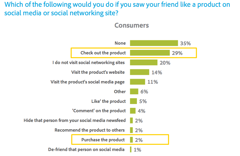 When survey respondents were asked what they would do if they saw a friend like a product on social media, almost a third (29 percent) said they would check the product out, five percent said they would like the product themselves and a click-happy two percent reckoned they’d buy the product right away