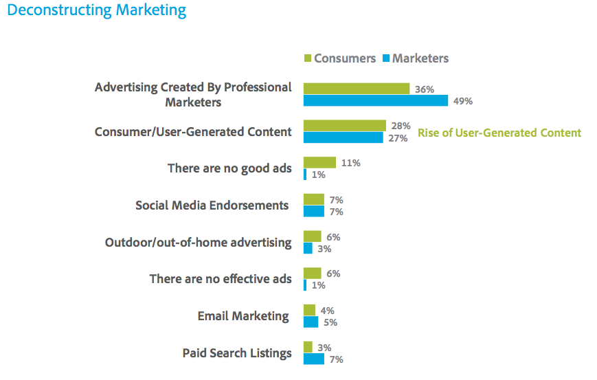 In terms of which types of ads are considered most effective, the survey found a large proportion (28 percent) of respondents rated user-generated content as an effective ad medium. Paid search listings are considered the least effective — with just three percent of consumers rating them as effective