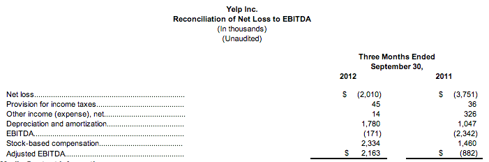 Because of these limitations, you should consider Adjusted EBITDA alongside other financial performance measures, including various cash flow metrics, net income (loss) and Yelp’s other GAAP results. For a preliminary reconciliation of historical non-GAAP financial measures to the nearest comparable GAAP measures, see “Reconciliation of Net Loss to Adjusted EBITDA” included in this press release.