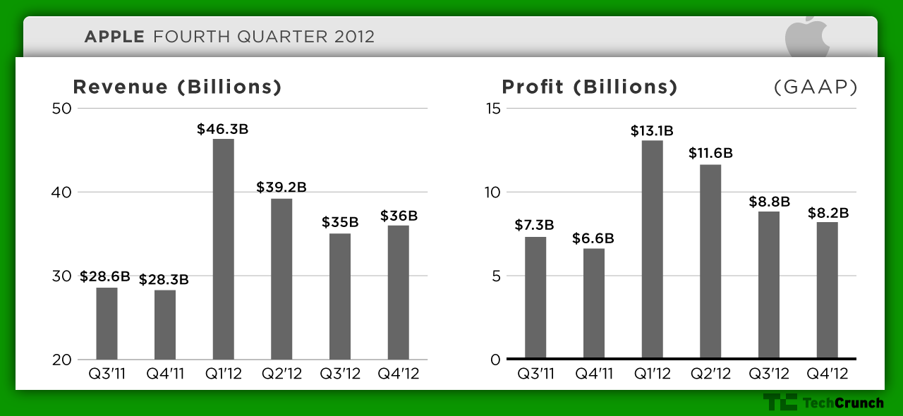 Apple has just released its fiscal Q4 2012 earnings, and the consumer computing giant reported generating $36 billion in revenue (compared to $35 billion in Q3, and $28.27 billion in the year-ago quarter).