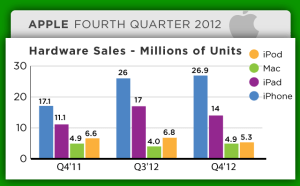 Apple had another solid quarter for hardware sales, with iOS device sales leading the charge. iPhone sales were up from last quarter, though slightly under analyst expectations. Sales possibly rose a bit thanks to the iPhone 5, which was on sale for a little while ahead of the end of the quarter on September 30. Sales of the iPhone also grew 58 percent year over year.