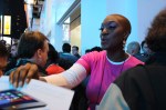 Now, remember those free jackets the first people in line got? They proved to be more trouble than they were worth for some on this mild October night — once inside in store proper, temperatures spiked dramatically and little bottles of water were being ferried out onto the street.
