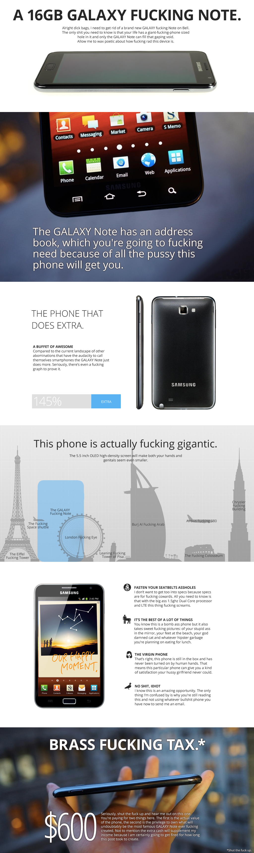 Samsung is in the process of launching a new Samsung Galaxy Note II, but we’ve just received strong evidence the original may be even better. Courtesy of a Craigslist Toronto classified ad (via Twitter), take a look at this beauty of a pitch that tells you everything you need to know about Samsung’s original phablet. In the words of the original poster, “Fasten your seatbelts assholes”: