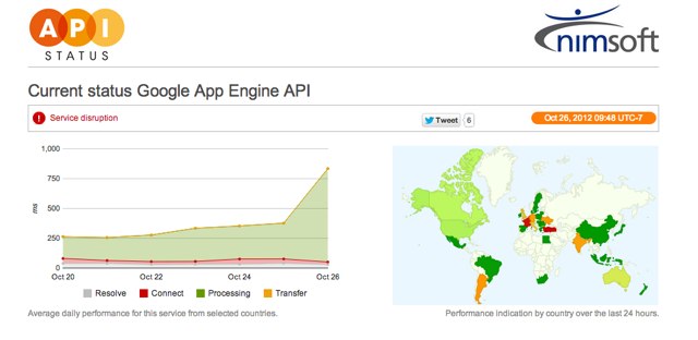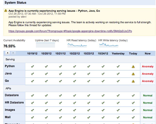 At approximately 7:30am Pacific time this morning, Google began experiencing slow performance and dropped connections from one of the components of App Engine. The symptoms that service users would experience include slow response and an inability to connect to services. We currently show that a majority of App Engine users and services are affected. Google engineering teams are investigating a number of options for restoring service as quickly as possible, and we will provide another update as information changes, or within 60 minutes.