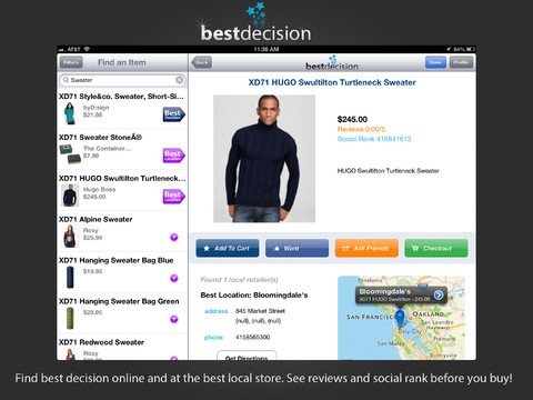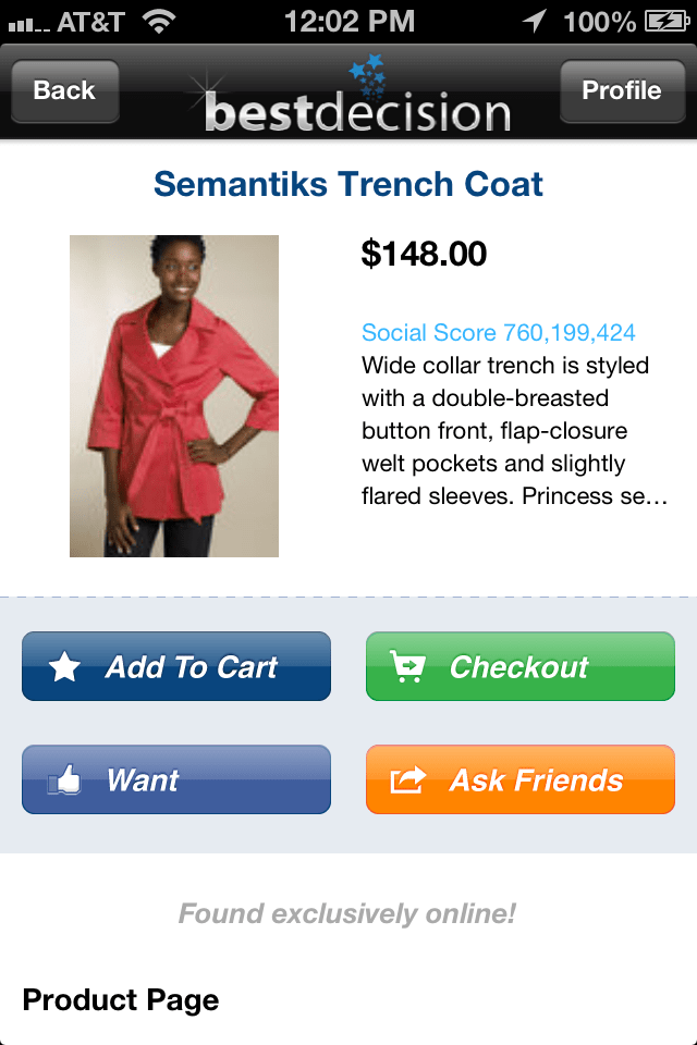In August, the startup released an early version of its iOS application which was something like a catalog app, allowing users to search across various e-commerce sites’ inventory and ask friends for opinions on what to buy via email, Facebook, Twitter or SMS. The app today looks similar, but now introduces the universal shopping cart functionality. When you find items you like, you can simply tap “add to cart” as if everything in the app comes from a single retailer. After filling your basket, you checkout just the one time, and Best Decision handles the checkout process on the various retailers’ sites on its own backend. How exactly it does this is LEAP’s “secret sauce” – and one which the company has a few provisional patents for, as well.