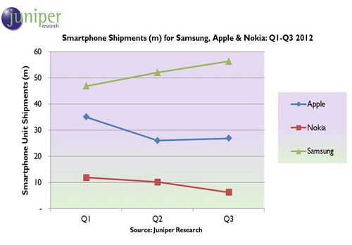 Analyst Juniper also reported 56.3 million smartphone shipments in Q3 for Samsung vs 26.9 million for Apple. Juniper said Samsung’s flagship Galaxy SIII device played “a key role” in Samsung’s record quarter — with estimated sales of 18 million for the device in Q3.