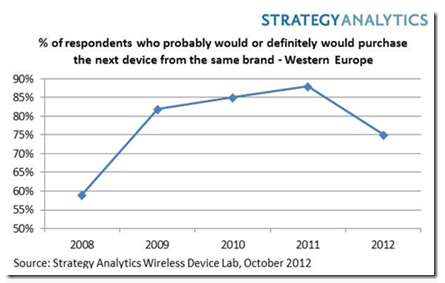 In a separate report on iPhone owner brand loyalty, Strategy Analytics also noted that the number of iPhone owners who say they definitely will or probably will purchase their next phone from the same brand has declined in both the U.S. and Western Europe for the first time — dropping from 88 percent in 2011 to 75 percent in 2012. The analyst says a key factor in this decline is rival smartphone makers offering devices with larger screens than the iPhone.
