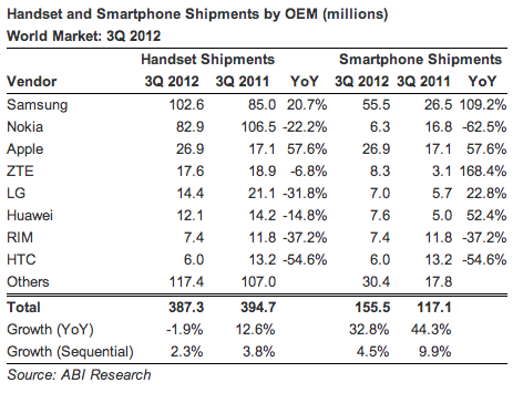 Android OEM Samsung retained its number one smartphone maker position in the quarter and shipped more than double the smartphones of second-placed Apple, according to the analyst figures. ABI Research has Samsung shipping 55.5 million smartphones in Q3 2012 to grab a record 35 percent marketshare, versus Apple’s 26.9 million smartphones (and 17 percent marketshare).