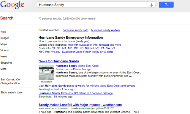 Additionally, you can Google “Hurricane Sandy” and get a nice bit of information based on where you live: