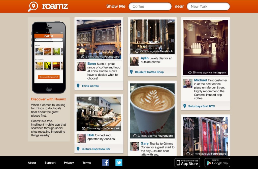 Online, the experience is nearly identical, save for the larger format. Although you can perform similar local searches on Foursquare.com (and Foursquare on mobile), the benefit of using Roamz is that you’re not just limited to Foursquare’s data. When testing the service to find frozen yogurt shops, for instance, I found photos and reviews from Foursquare, Facebook and Instagram filling my search results. These included interior shots of the stores, Instagram photos of the frozen treats, and even coupons and posts about store openings from Facebook.