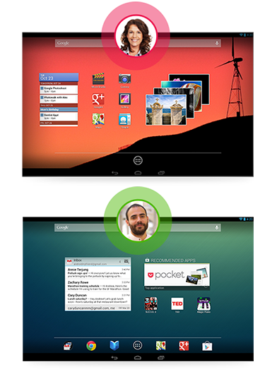 With support for multiple users, you can give each person their own space. Everyone can have their own homescreen, background, widgets, apps and games – even individual high scores and levels! And since Android is built with multitasking at its core, it’s a snap to switch between users – no need to log in and out. Available only on tablets.