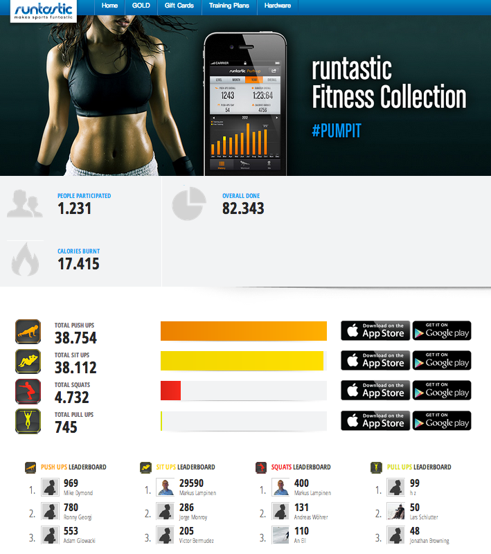 To connect these new apps to the Runtastic platform — and to each other — the company also today released a new page on its website called PumpIt, which ranks the community’s activities across the four apps in a master leaderboard and automatically uploads stats from each workout to both PumpIt as well as the user’s personal fitness profile.