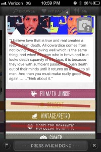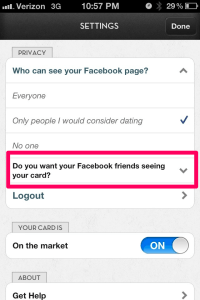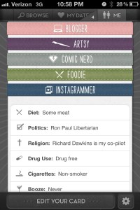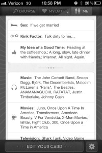 You can download Let’s Date from the app store (right now, you can only date and find people in the San Francisco area – they plan to expand to other regions soon) and create your account using Facebook Connect. Here’s the catch though, you must have 50 friends in order to join. Once you join, their service analyzes your interests on Facebook to help populate what they call a “dating card”. You fill out some entertaining questions about yourself, put up a favorite quote or two and then this is something I find interesting. You can hide your card from your friends on Facebook. That’s smart. You might want to branch out of your social sphere and meet new people. You also might not want your friends to know you are dating or intimate details about you and your dating preferences.