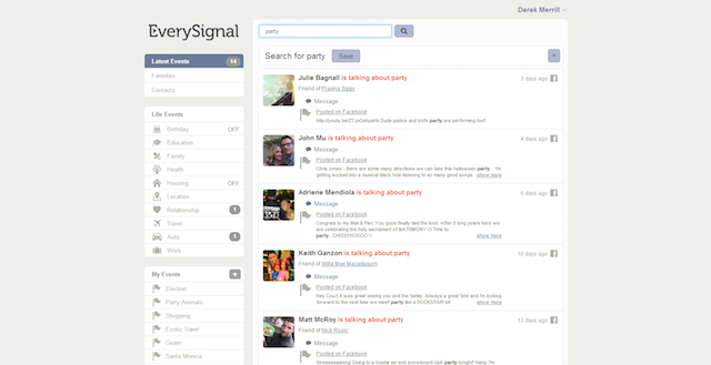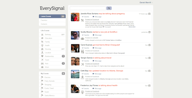 To use EverySignal, users login via Facebook where they’re then presented with a dashboard view of their friends’ updates on social networks. These are broken down into 10 categories, available to click into using the left-side navigation. The categories include the following: Birthdays, Education, Family, Health, Housing, Location, Relationship, Travel, Auto and Work.