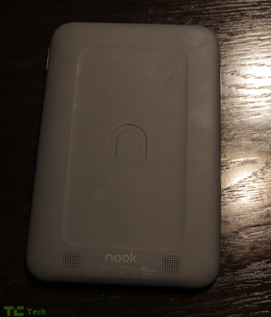 At the bottom is a 30-pin charging and syncing port next to a pinhole LED and MicroSD card slot hidden under a plastic flap. There’s a power button on the left side and volume buttons on the right. A central “Nook” button is at the bottom center of the screen.