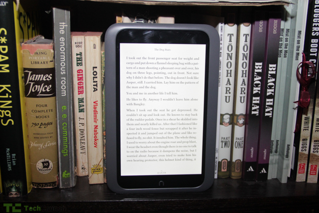 The Library screen really takes advantage of the device’s high-resolution screen. Because the book icons are so small, it’s clear that the 1440 x 900 pixel screen really comes in handy when viewing content. It doesn’t, however, come in handy on the reading screen. If you’re used to standard definition displays the Nook’s display is glorious. If you’ve seen a Kindle or iPad with Retina display, the amazement is somewhat lessened. However, the text does look like it’s “printed” on the screen and is very crisp and clear.