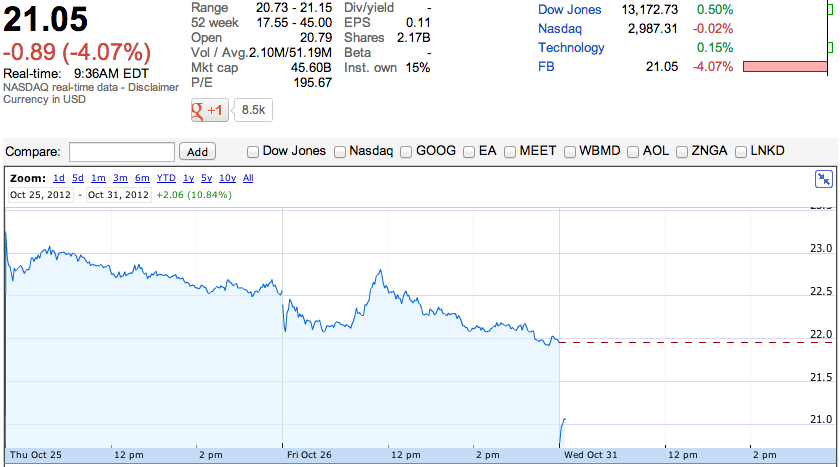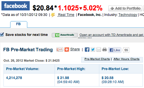 Facebook’s stock closed at 21.94 last Friday. The lockup was supposed to expire on Monday, but Hurricane Sandy forced NASDAQ to close for two days. The stock was expected to take a hit as employee shares are available on the market for the first time, with more coming next month.