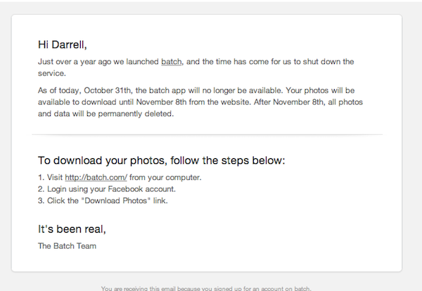 Today, the “Batch team” sent out an email to its users informing them that they should download their photos, because the service will be shutting down today:
