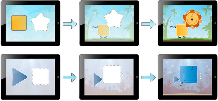 In my experience, kids are using iPhones and iPads younger and younger. Our eight month old stares intently at pictures of baby faces on the iPhone and my son and daughter knew how to slide to unlock before they could crawl. This gives them something fun to do on the iPad and, using capacitive touch points, allows them to put shapes right on the on-screen representations in order to win games and interact with characters.