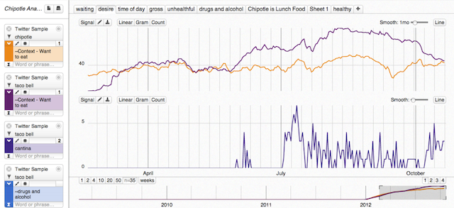 To use the service, investors log into Lucky Sort, select the data sets they want to work with, and then run queries. The data is read-only as well, for compliance purposes. Once logged in, investors can add stocks and keywords or phrases they want to research, which can be general terms like “short” or “sell” or specific phrases related to ongoing discussion within the community related to the given company. For example, a query for “want to eat” demonstrated to the StockTwits community that enthusiasm for Taco Bell’s new menu was likely temporary. (see example below)