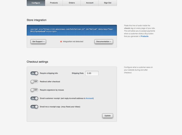 With Helium, you add a line of JavaScript and then another line of code wherever you want a “Buy Now” button. You’ll get a dashboard that shows you recent orders and lets you easily add items.