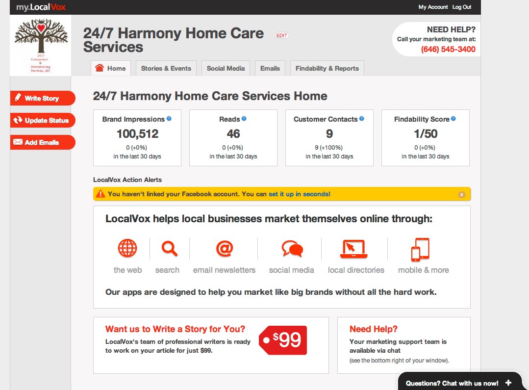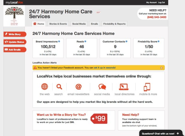 The suite gives small businesses a redesigned dashboard that allows them to easily track the visibility of their brand on social media channels, how many people are reading their content, and how many people they can reach through LocalVox through its new Klout-like “findability score.” It also includes tools for automatic emails to customers; Facebook and website updates; the ability to publish content across a network of publishers; and the option of updating listing information on 100 different directories.