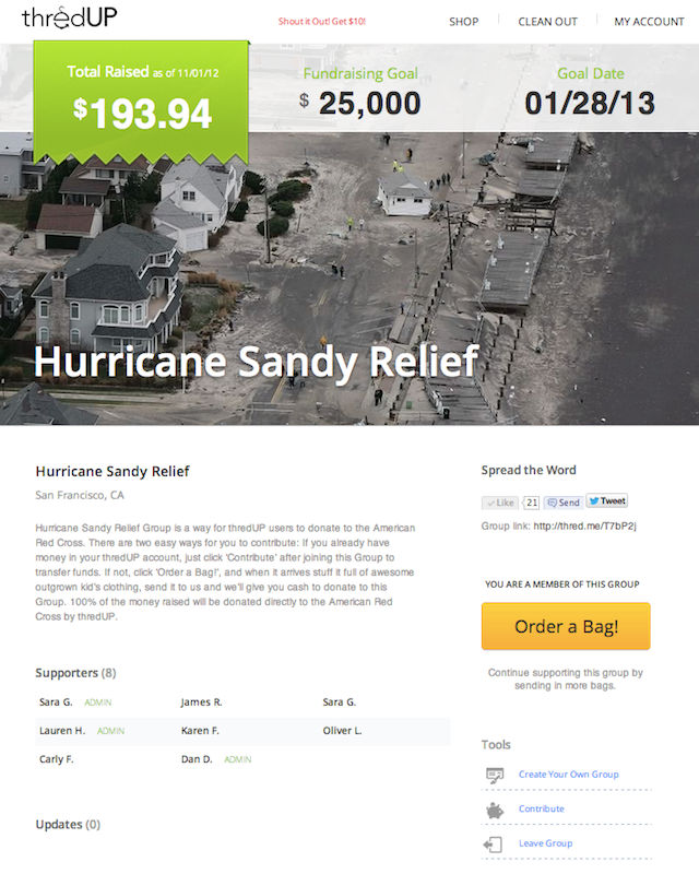 Online consignment shop thredUP is launching a timely new feature called Groups, which allows consumers to use the service in order to generate cash donations for charitable causes. As you may have guessed, the company is kicking off the launch with a group dedicated to Hurricane Sandy relief.
