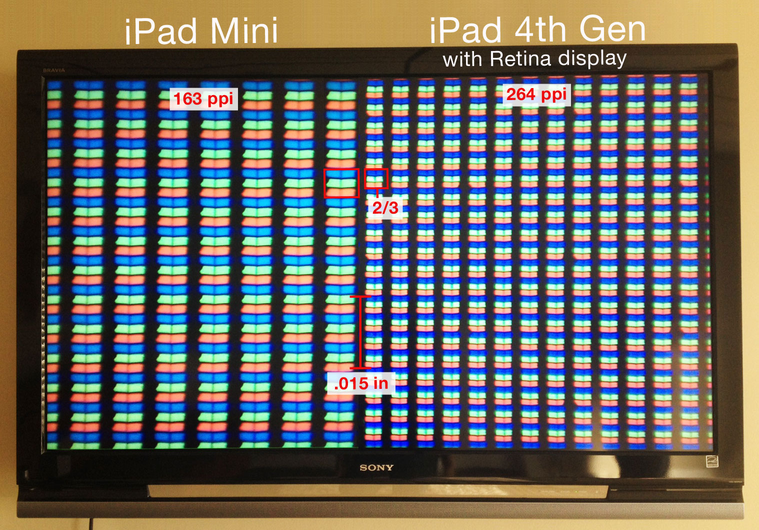 So what’s the upshot for users? Repair Labs says that the pixels of the 4th-gen iPad are 16 percent larger relative to the iPad mini than the iPad 2, making the difference between the two screens less noticeable, and in fact, “to the naked eye, it’s negligible,” the gadget repair site says. While I can personally attest to the fact that it takes some adjusting to go back to a non-Retina mini from a Retina iPad or even a Retina MacBook Pro, I definitely agree that it’s a lot better than jumping all the way back to an iPad 2. And over time, going between the mini and the latest full-sized iPad only gets easier.