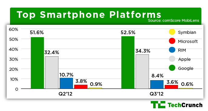 Smartphones were used by 51 percent of those surveyed, up 8 percent since the June quarter. Android was the top smartphone platform during the period, nabbing 52.5 percent of the overall market. That was up 0.9 percentage points from the quarter ending in June. Apple’s iOS also gained, going up 1.9 points between the two measurement periods, from 32.4 percent to 34.3 percent. RIM was the big loser, dropping 2.3 percentage points from 10.7 to 8.4 percent of the mobile OS market. Both Microsoft and Symbian also saw slight decreases in share during the period.