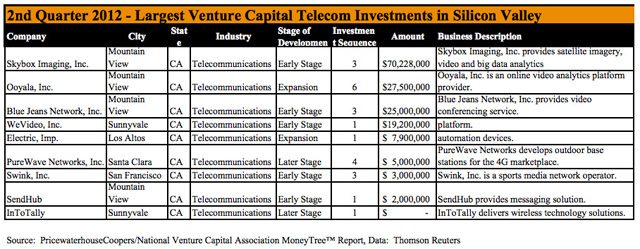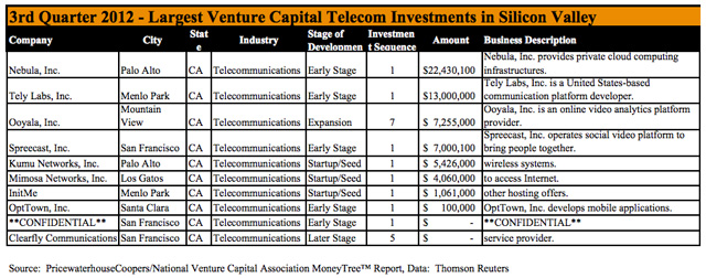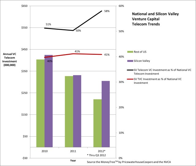 Silicon Valley leads the nation with more than 50 percent of telecom venture investments, and its share is growing. The reason for this is that companies such as Google, Apple, VMware and Salesforce have redefined the meaning of the telecom carriers business to include Internet, mobile and cloud with wireless, terrestrial and satellite transmission of voice and data.